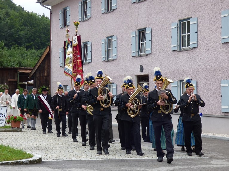 Achthaler Kirtag 2017 mit Geistlichem Rat Pfarrer Anton Parzinger beim Einzug zur Patroziniumsfeier ins Festzelt mit der Knappenkapelle Neukirchen am Teisenberg.