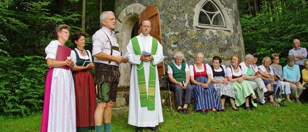 Am Sonntag, 27. Mai 2018, um 15 Uhr, war es wieder so weit. Bei wunderbarem Sonnenschein und der herrlich aufblühenden Natur fand die traditionelle Maiandacht des Fördereins Bergbaumuseum Achthal bei der Almbauernkapelle am Kressenberg statt.