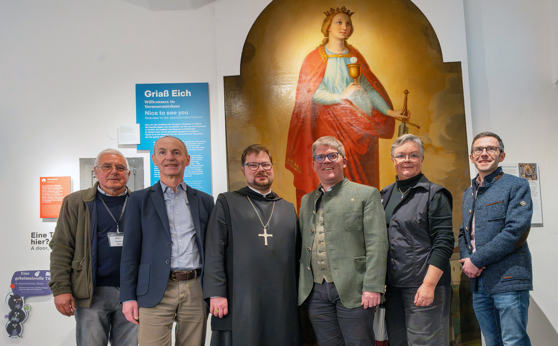 Im Bergbaumuseum Achthal: v.li. Vorstand Roland Klosa, Mag. Georg Stadler, Erzabt Jakob Auer OSB, P. Prior Virgil Steindlmüller OSB, Kuratorin Dr. Ulrike Laufer, Stiftsarchivar Dr. Gerold Hirtner